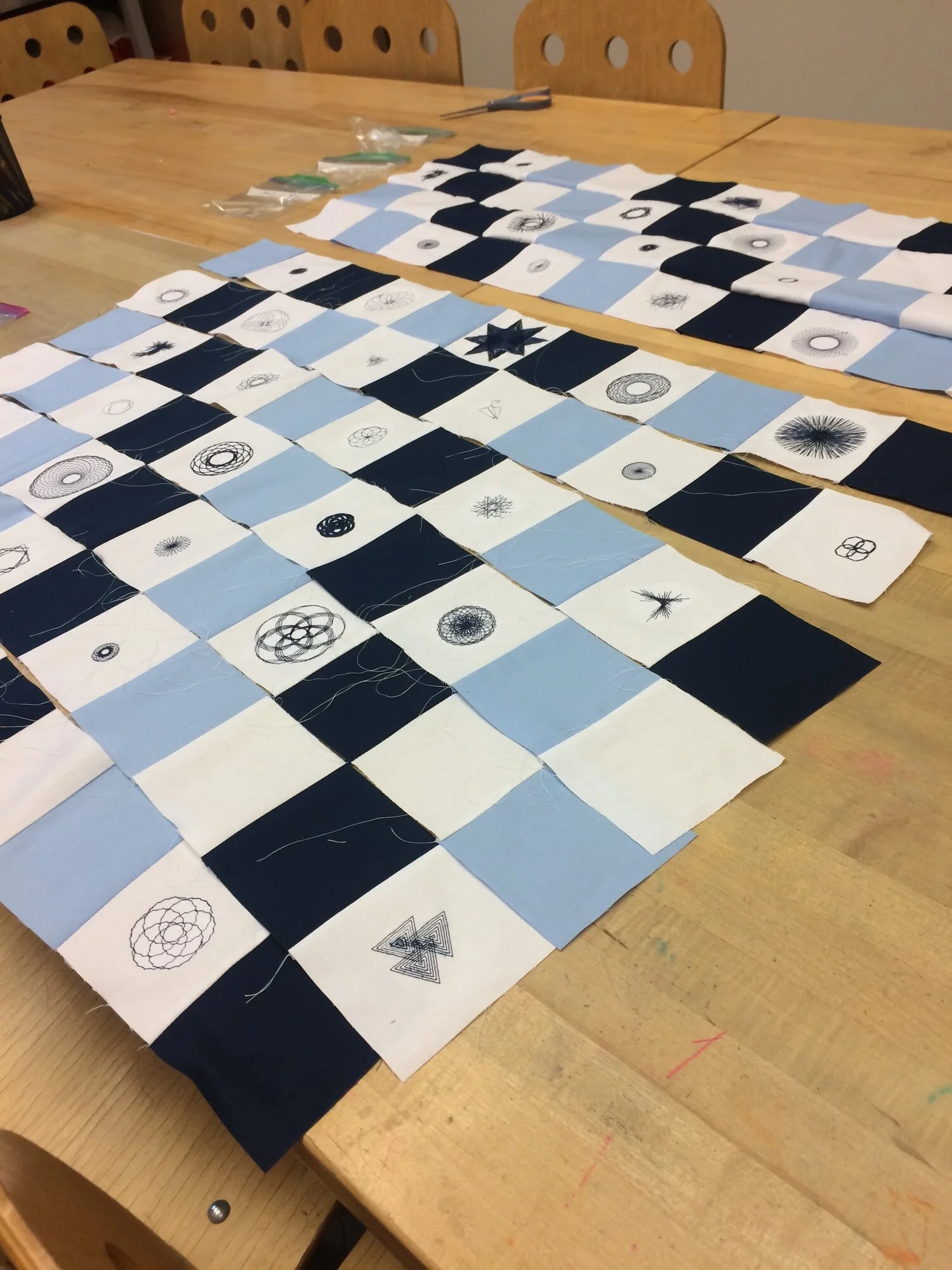 This project explores new forms of classroom collaboration between students through a community-created quilt enriched with digital tools and machines. Beginning as an exercise in creating a democratic classroom, students proposed and voted on color schemes and layouts for the class quilt. Using the visual programming language TurtleStitch, students coded three original works of art generated by an algorithm of their own imagining. Students embroidered the designs onto fabric and combined their designs to create a quilt. Additional quilt squares were cut on a laser cutter and the quilt was finished by hand. Throughout the process, students sought feedback on their designs from their peers, divided tasks up among themselves, and assisted one another in learning new tools whenever possible.